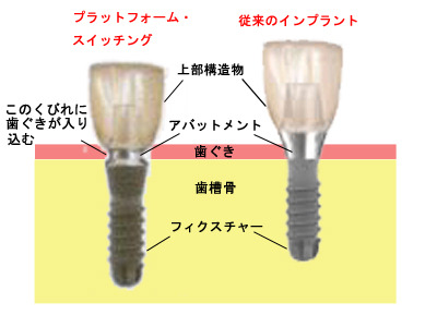 また、プラットホーム・スイッチングでは、接合部が内側に設定されるため、インプラントと骨との接合部が粘膜で覆われ、結果、歯肉の厚みが増えることになります。 歯肉の厚みが増えると血流量も増え、細菌に対する粘膜の抵抗力も増える。これで、骨の吸収を防ぎ、歯肉の退縮も防ぎ、審美的にも機能的にもインプラントが長持ちすることにもなります。