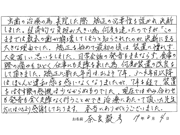 現在ではかみ合わせも発音も全く支障なく行うことが出来、治療にあたって頂いた先生方には心より感謝しております。本当にありがとうございました。